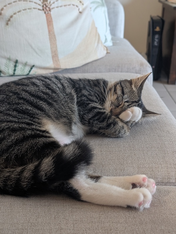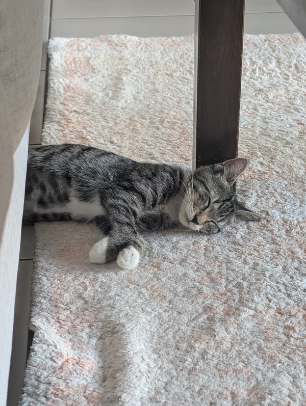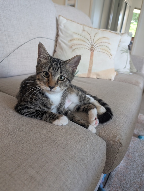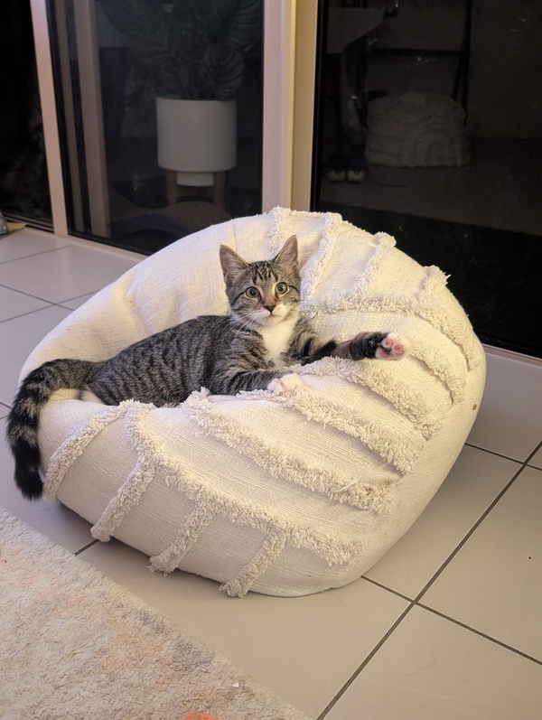Saturn loves to explore, chase crinkly toys, and find the coziest spots to curl up for a nap. She's affectionate without being clingy-happy to cuddle when you're ready, and equally content to entertain herself with curious kitten antics. Her calm nature makes her a perfect companion for a relaxed home, though she can definitely keep up during playtime!