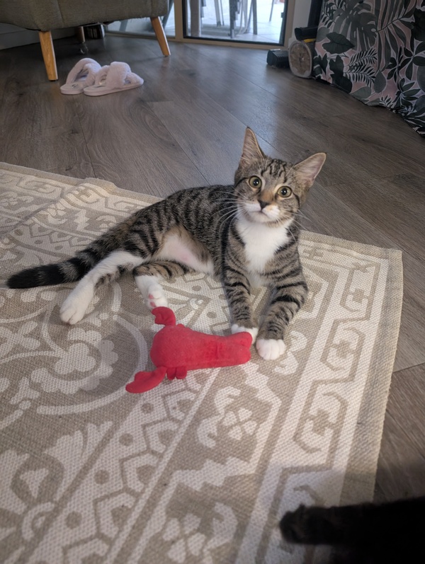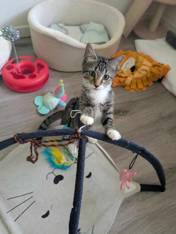 Say hello to Saturn, a stunning grey smoke tabby kitten with a soft, silvery coat and eyes full of wonder. This celestial cutie is equal parts elegant and playful, with a gentle spirit that will instantly win your heart.