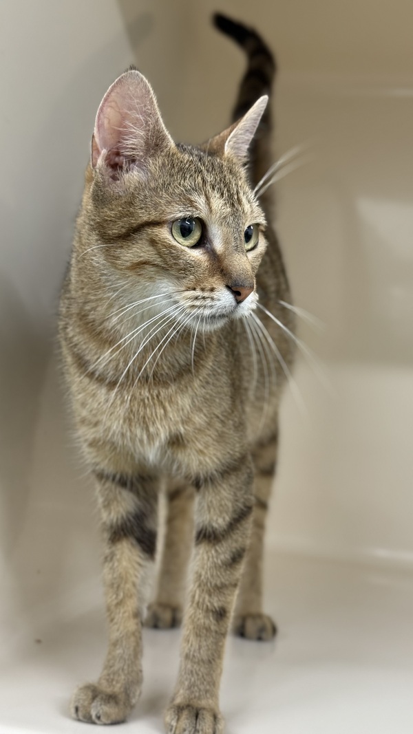 Elsa should be started in a launch room to help her settle into a smaller, secure space before exploring the rest of her new home. Providing her with plenty of safe spots-like cat trees, shelves, and hides-will help her feel comfortable and supported as she adjusts.