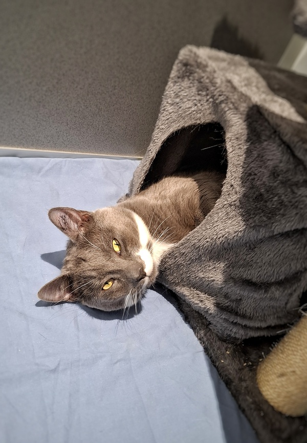 Zane is a gentle, affectionate boy who loves rubbing against your legs and soaking up pats and scratches. He's a big fan of cozy hidey spots where he can lounge in peace, and while toys aren't on his radar yet, he's all about comfort and cuddles.