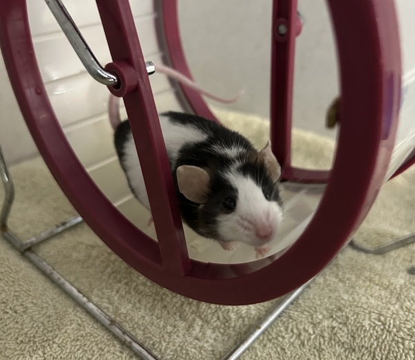 Meet Bolt, a male mouse with a white and black coat. Mice are relatively easy to care for, requiring daily feedings and weekly habitat cleanings. Did you know that mice make great, interactive pets? Like any animal, the more positive human interaction they experience, the more comfortable they will be around us. Although mice don't need long walks like dogs, or giant scratching towers around the house like cats, they still require physical exercise and mental stimulation to keep them happy and healthy, just on a smaller scale. You can get creative with your toilet paper rolls, tissue and cereal boxes to make fun new hidey holes and tunnels for your mice to explore. Twigs and branches also make great enrichment toys. Mice require a constant supply of high quality rodent mix as well as fresh fruit and veggies,