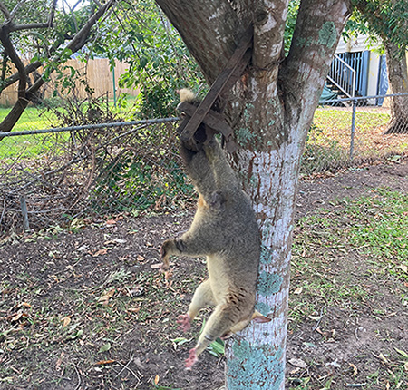 A poor brushtail possum had his leg caught by a nasty steel jaw trap and was hanging from a tree. The possum was in immense pain and distress.