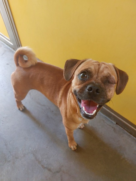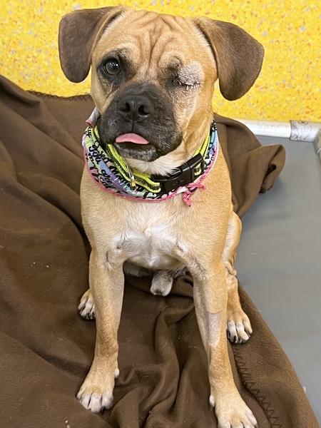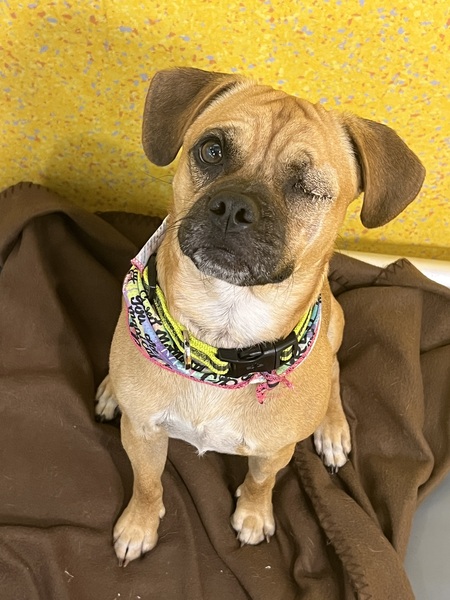 Prince is a little more reserved at first, partly due to having only one eye and a limited view of his surroundings. Once he feels secure, he loves chin scratches and will nuzzle his muzzle into your hand for some extra attention. He can alarm bark at times, so he would thrive in a quieter home with minimal foot traffic and a calm environment. Despite this, Prince is open to finding the right family who can give him patience, love, and guidance. Prince has met other dogs at the shelter and was calm and respectful, even with a young reactive dog, showing he could be a great companion for another little dog. With the right family, Prince's affectionate, cheeky personality will shine, and he's ready to bring love, loyalty, and fun to his new home.
