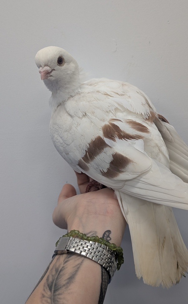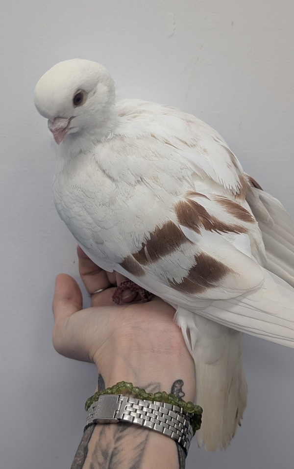 Strix is a delightful little Old German Owl pigeon, complete with the breed's signature frill and bright, curious eyes. The "Old" is just part of the name - Strix is simply full of gentle charm and quiet character.