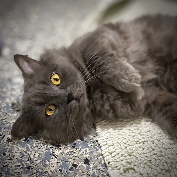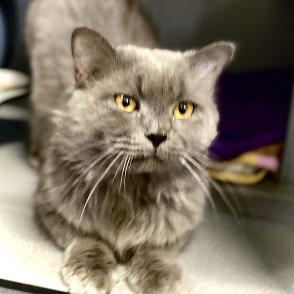 Please meet our very special boy! Do you find that hearing your cat purring to be very soothing to you? We have Hudson who can do that for you. He has lots of time for this and will be a great companion. Hudson has thick, grey fur, a slightly squishy face and the most outstanding gold eyes. He has a wonderful gentle nature. Once he loves you, you won't be on your own anymore. For Hudson's longevity and care, please read on:-