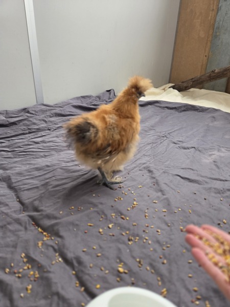 This lovely Silky, Puff, has likely had limited handling in the past, and as a result is still shy about being touched. While they'll confidently spend time near people in their pen and are happy to approach a hand offering grain or seed, they aren't comfortable with being picked up just yet and will quickly run off when an attempt is made.