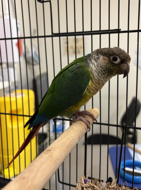 Princess is a beautiful, hand‑tame pineapple green cheek conure who is ready for her forever home. With her warm peach, yellow, and green tones, she's as lovely in personality as she is in colour.