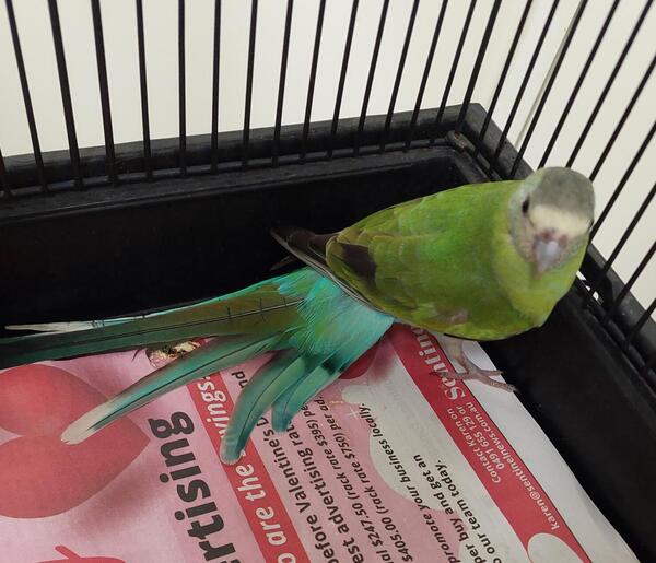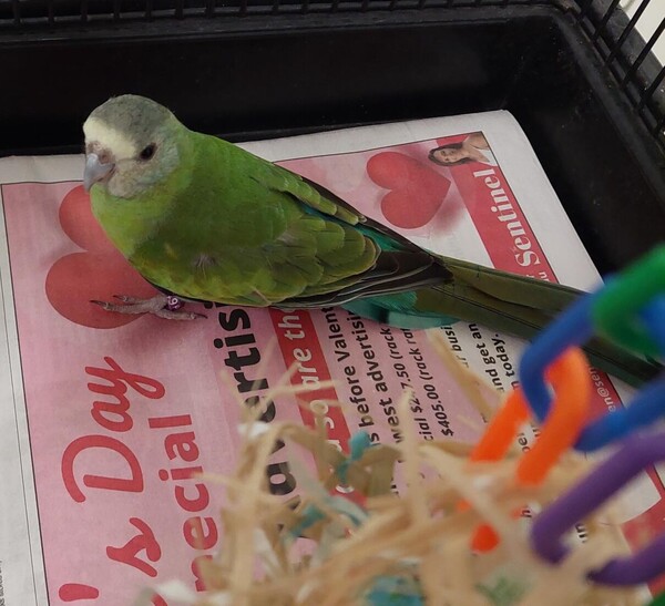 Nibbles is a Hooded Parrot who is still gaining confidence with handling and will need a patient, dedicated adopter to continue gentle socialisation and trust‑building.
