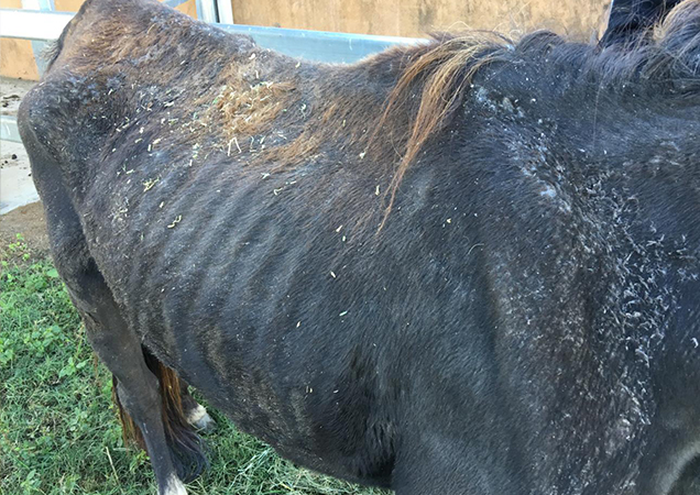 When our Inspectors saw Tennessee the pony roaming at the property, she was living in amongst a large amount of rubbish, hazards and dead animals. She also was significantly underweight and didn’t have access to appropriate food, water or shelter. Poor Tennessee was also lame in her left hind leg and veterinary assessments showed she had dental disease and was close to being emaciated. She looks like a totally different pony now and has since been adopted!